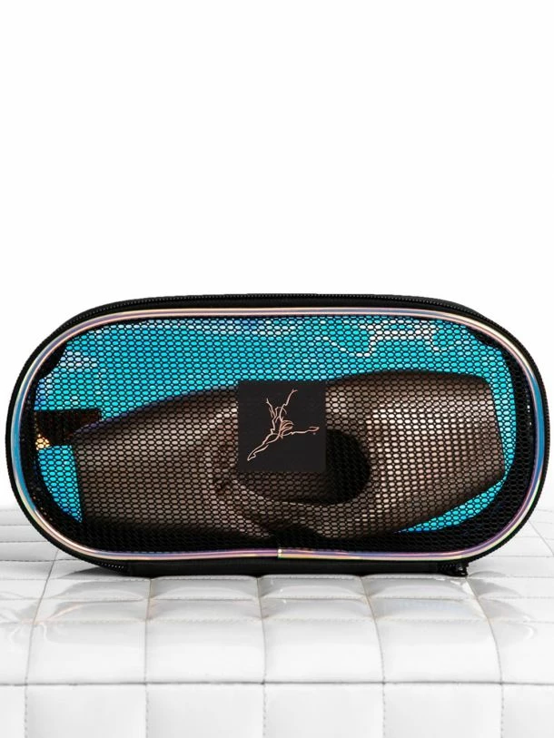 Sleek pointe shoe case with holographic piping. Made of polyester and translucent PVC materials that are soft, lightweight & protective. Features a gold Capezio logo and mesh front for much-needed aeration. The clip can be used to attach the pointe shoe case to the outside of another dance bag.