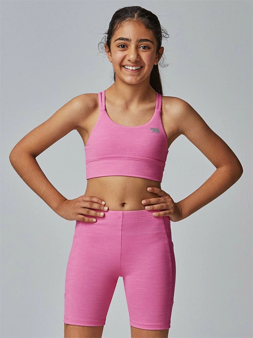 With comfort our design priority, the Girls Lotus sports bra is perfect for all-day wear for sport or leisure. Constructed from gutsy Supplex Compress for superior comfort and a supported silhouette, and offered this season in this gorgeously girly bonbon marle colourway. Team with her favourite leggings or sport tights for a range of workouts such as yoga, martial arts, dance and trampoline.