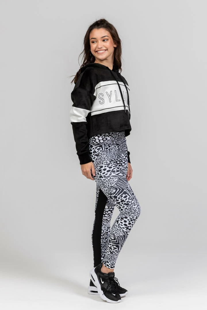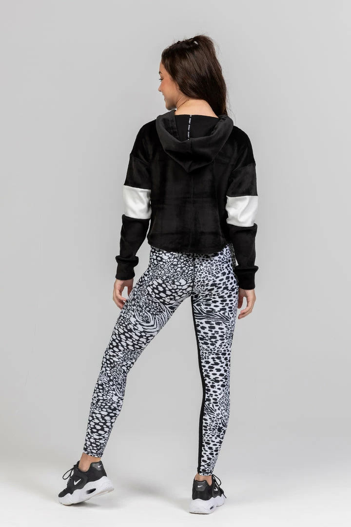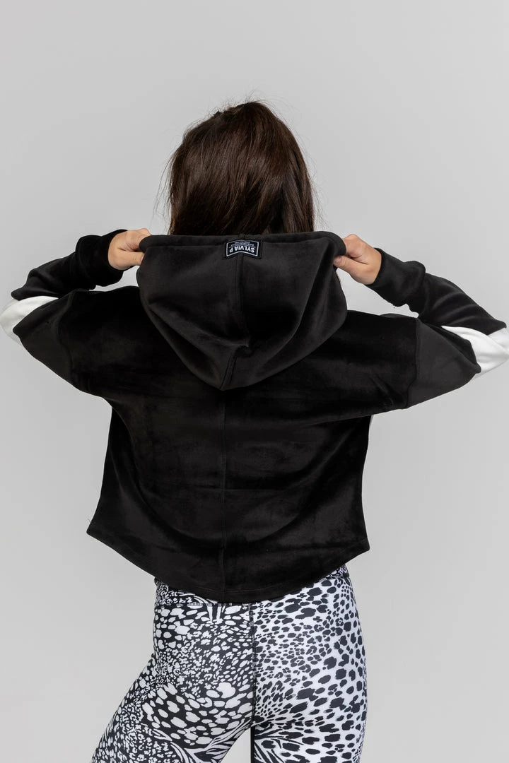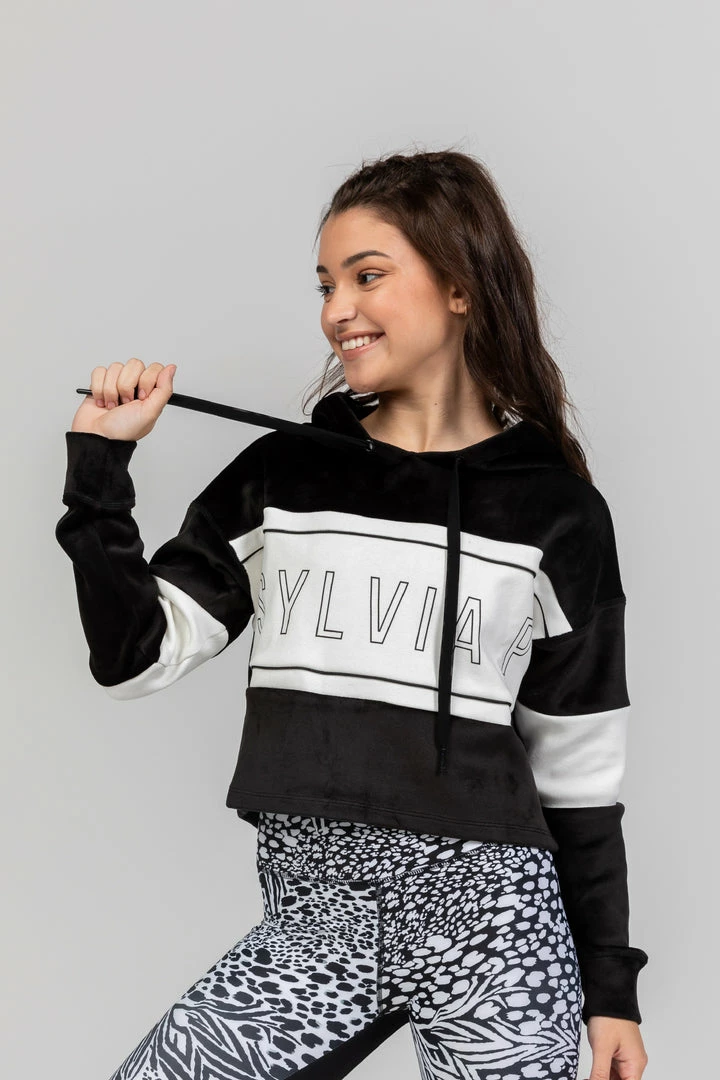 The ultimate in athleisure dressing – this hoodie will become your branded staple for all seasons when there is a chill in the air. Classically styled in black and white spliced panelling with contrast piping detail and large branded Sylvia P logo. The shaping is slightly oversized, in a cropped length, just long enough to wear with our high waisted styles. The hood is oversized for when the weather turns with the addition of our mesh drawcords. Made from a luxuriously soft velvet fabrication that will not only keep you cosy and warm, it is really stretchy for total comfort. Ideal when worn layered over our tank tops and crop tops.