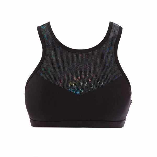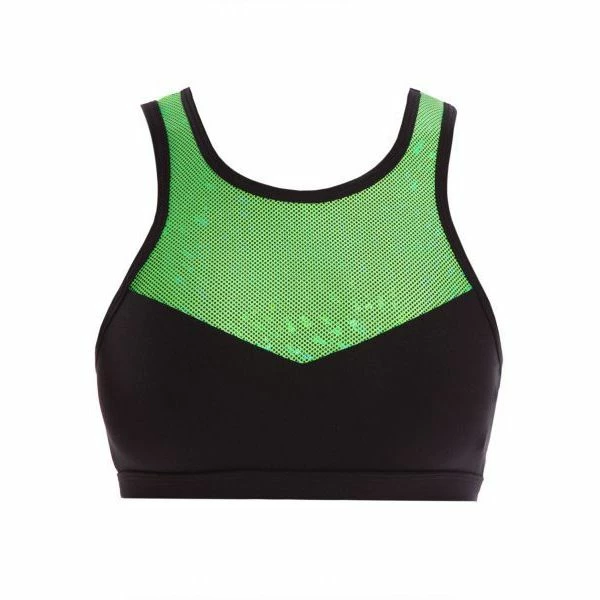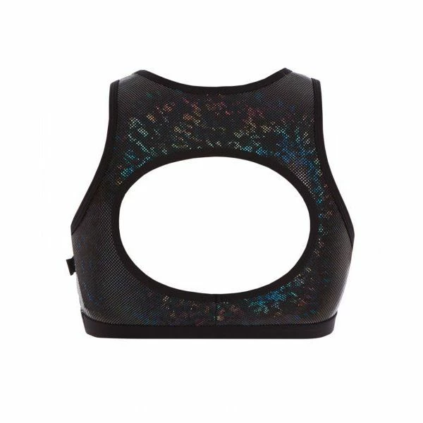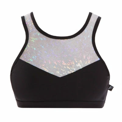 The Evelyn Crop Top is eye-catching and bold. Why you’ll love it: – High neck with Shattered Glass panelling for an on-trend look – Oval cut out adds unique detail at the back – Underbust binding and double front for added support – Metallic Shattered Glass fabric adds a touch of sparkle to your look – Available in a range of holographic colours to suit every dancer – Proudly a Product of Australia