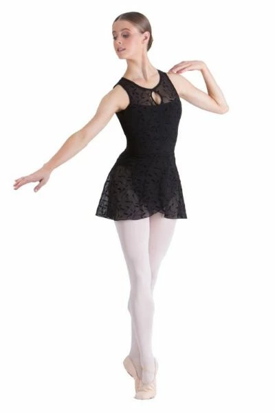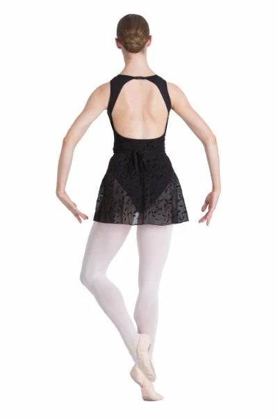 The Alexa Wrap Skirt is a beautiful ballet skirt with a delicate velvet leaf print design on soft mesh, and comes in black or white.