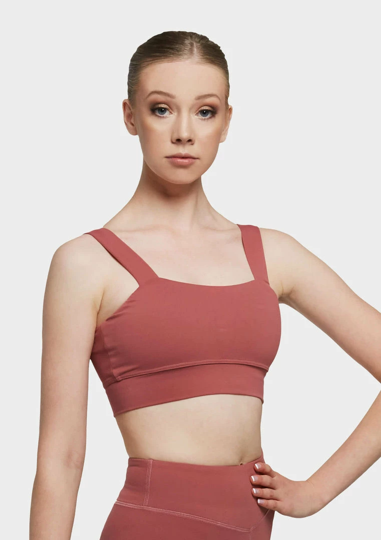 Cropped top featuring wide shoulder straps and waist band.