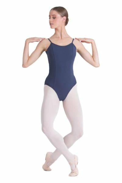 The Macey Leotard features a camisole strap design with a v-shape mesh scooped back. The perfect dance fashion leotard.Â