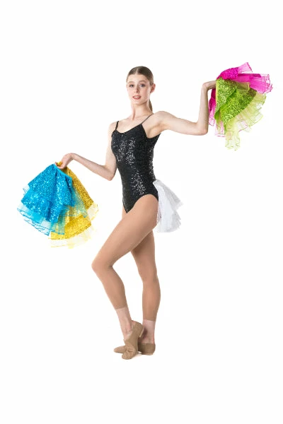 The Stepping Out Detachable Bustle will liven up any dance costume with layered sequin and tulle. It has built in press studs to pair with Sequin Leotard, Sequin Biketard or Attitude Sequin Shorts.