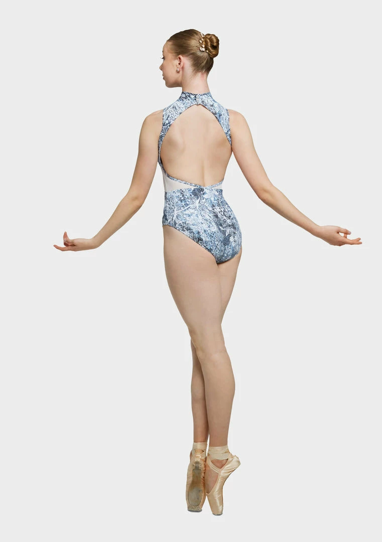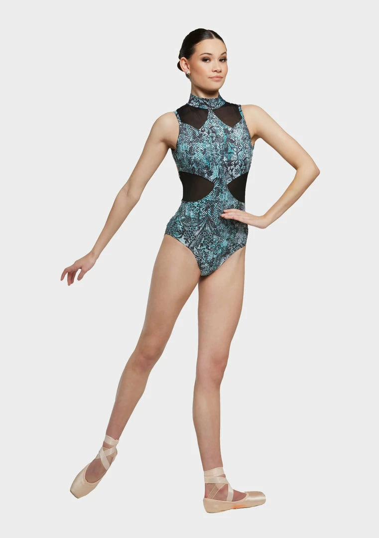 This leotard features a high front with neckband and back press studs. Shoulder and waist mesh panels and an open back.