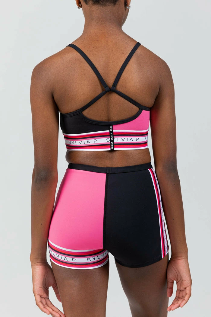 Our classic shape with a wild and high energy twist. Designed with colour blocked styling and a brightly coloured Sylvia P branded stripe through the legs to give you that confident feeling when tumbling at training. The waistline is finished off with an encased elastic at the top to ensure no riding or sliding up whilst performing at your best. Made from our signature SP Activate fabric that is quick drying, 4-way stretch, durable and made to move with you.