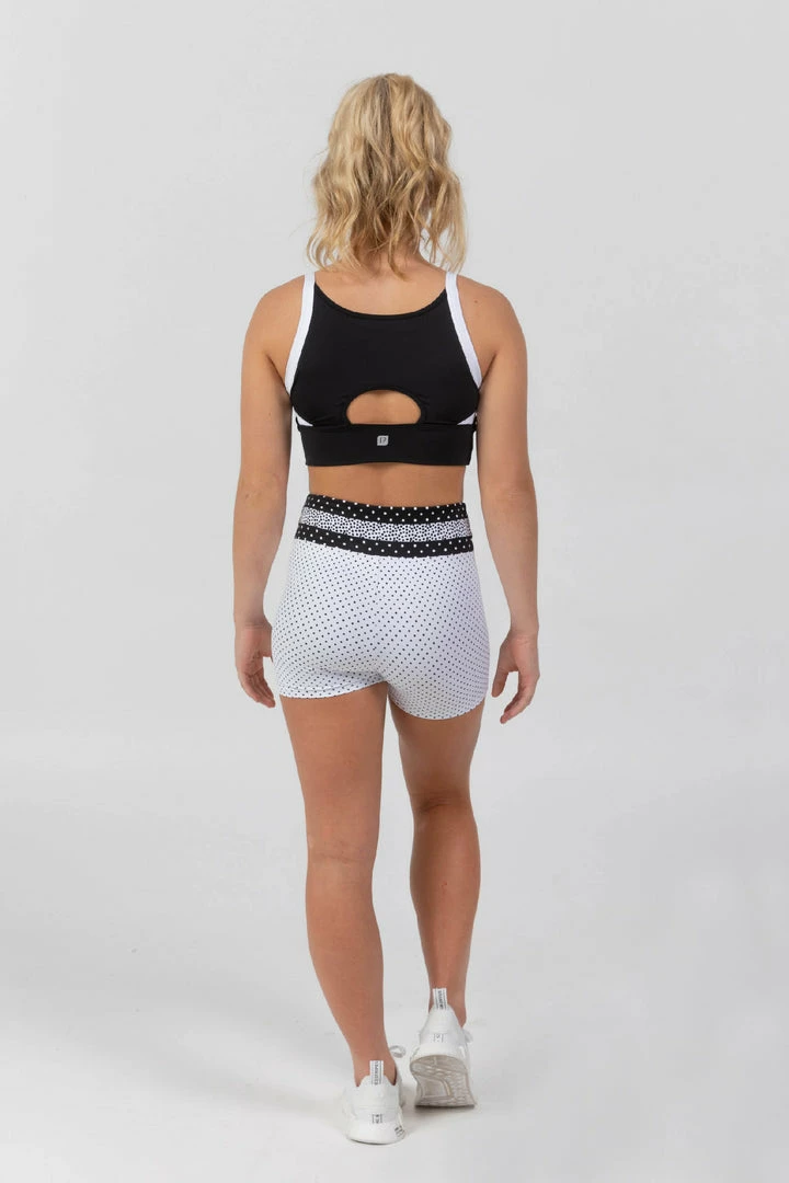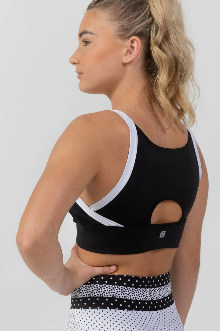 A new style staple, the Macpherson Crop Top is classically styled in black and white with wider coverage at the front, wide folded hemband and full coverage through the back with small keyhole. The design through the side features a wrap detail which is comfortable. Made from our classic recycled matt fabrication that is quick drying, flexible and designed to move with you. We added our “go the distance” neoprene lining that offers additional bust coverage and support when you need it most. Sylvia P branded logo on the back of this garment.