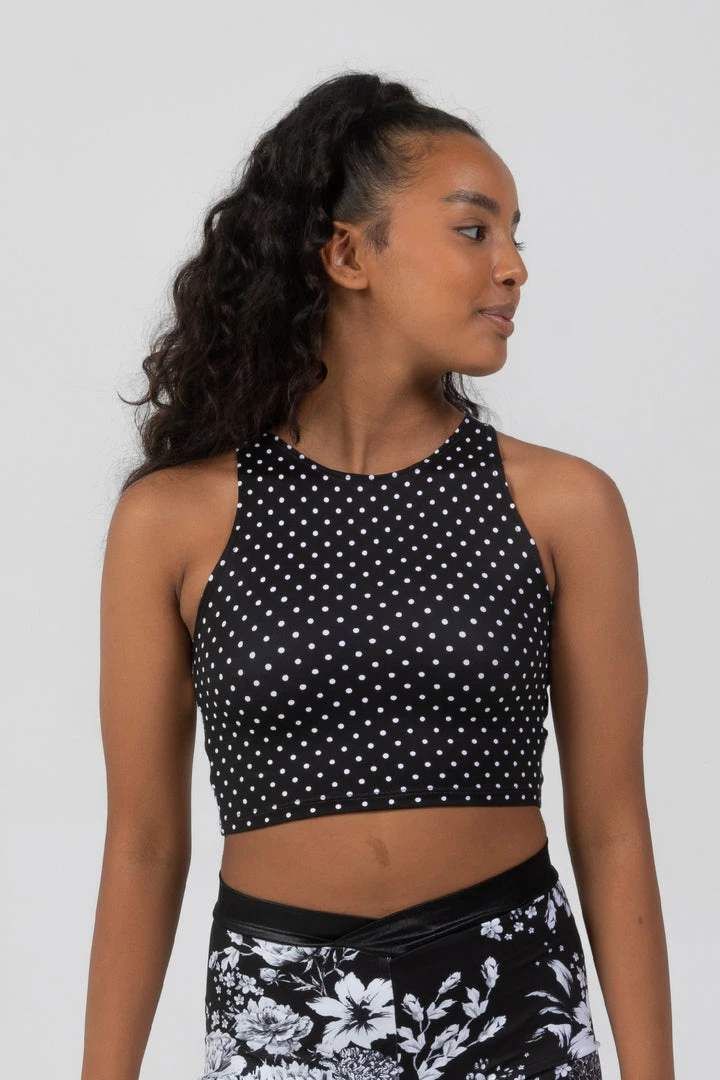 A classic single layer cropped singlet that you can wear back to front or front to back. Wear it two ways, flowers on the front or polka dots on the front. We have crafted this style so that the neckline sits in just the right spot no matter which side is the front. Featuring our classic black and white polka dot and exclusive monochrome hand painted floral. Made from our signature printed stretch fabric that is durable, flexible, and quick drying. Sylvia P branded logo on the floral side of this garment.