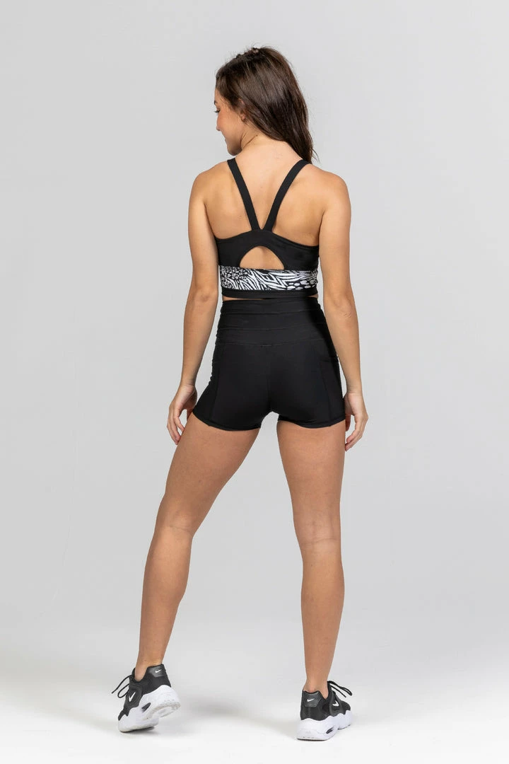 Support with a little bit of wild energy. This longer length crop top has been designed with comfort and coverage in mind. All seams are abrasion free and smooth finish. The longer length hemband allows just the right amount of coverage. Designed in a round neckline shape with flattering front panel lines, encased elastic straps & a back keyhole. Our Wilde animal print is featured in monochromatic black and white exclusively for Sylvia P. Made from our SP Activate fabrication which is quick drying, breathable and moisture wicking with a 4-way stretch and firm hold. Reflective silver SP logo on the back.